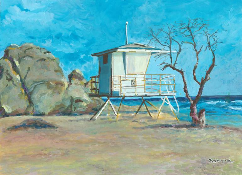 A summer afternoon on the beach of California amongst the Sycamore trees, this plein air piece was inspired by the iconic life guard stations known in Cali. Acrylic gouache on paper, mounted on wood cradle board.