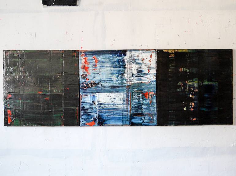 Triptych, they can hang any which way and either against each other or with a space in between. Acrylic on canvas with a satin varnish, although it seems pretty glossy for satin.