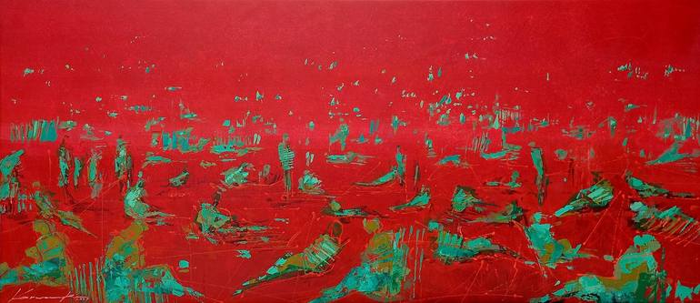 The painting depicts a minimalist beach scene, where the background is an intense, deep red, creating a strong contrast with the other elements. In the foreground are green silhouettes of people, shown as simple, almost geometric shapes. The figures are devoid of faces and other details, which gives...