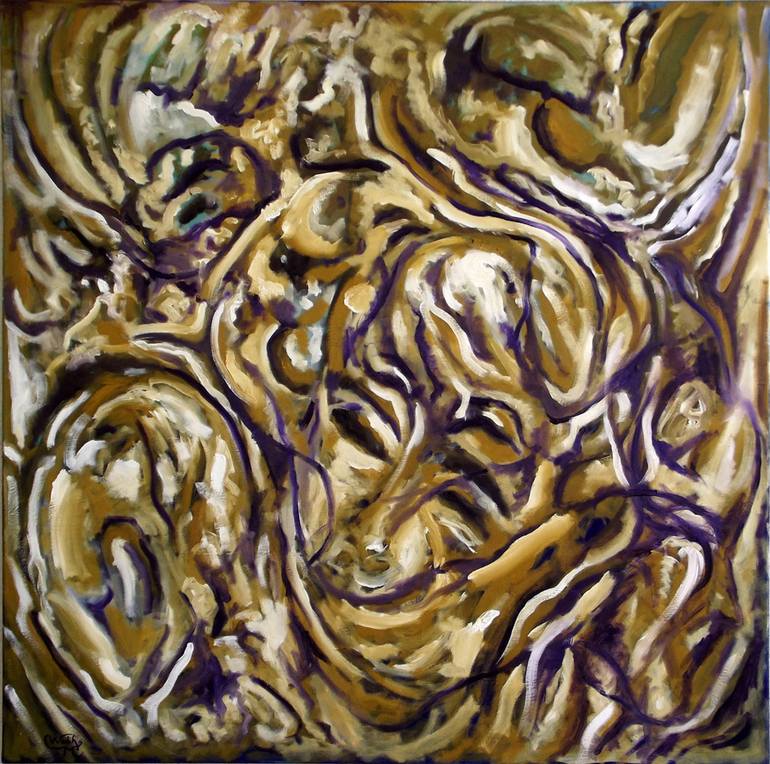 This painting is based on thick oil texture and colors. I use my graphical language to create shapes of combined figures. I use faces to describe a scene of kind of turbulence and dynamism which it came the name of "THE CHAOS" . The composition creates a vibrant uniform movement of lights and shadow...