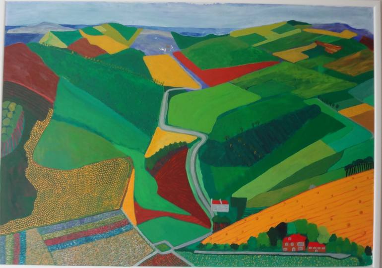 Inspired by Hockney ,did my own road , from days going surfing in North Devon and times in Welsh valleys although left a space for a town , wanted the viewer to put that in themselves with there mind when hung on there wall.Its acrylic as was an early piece.
