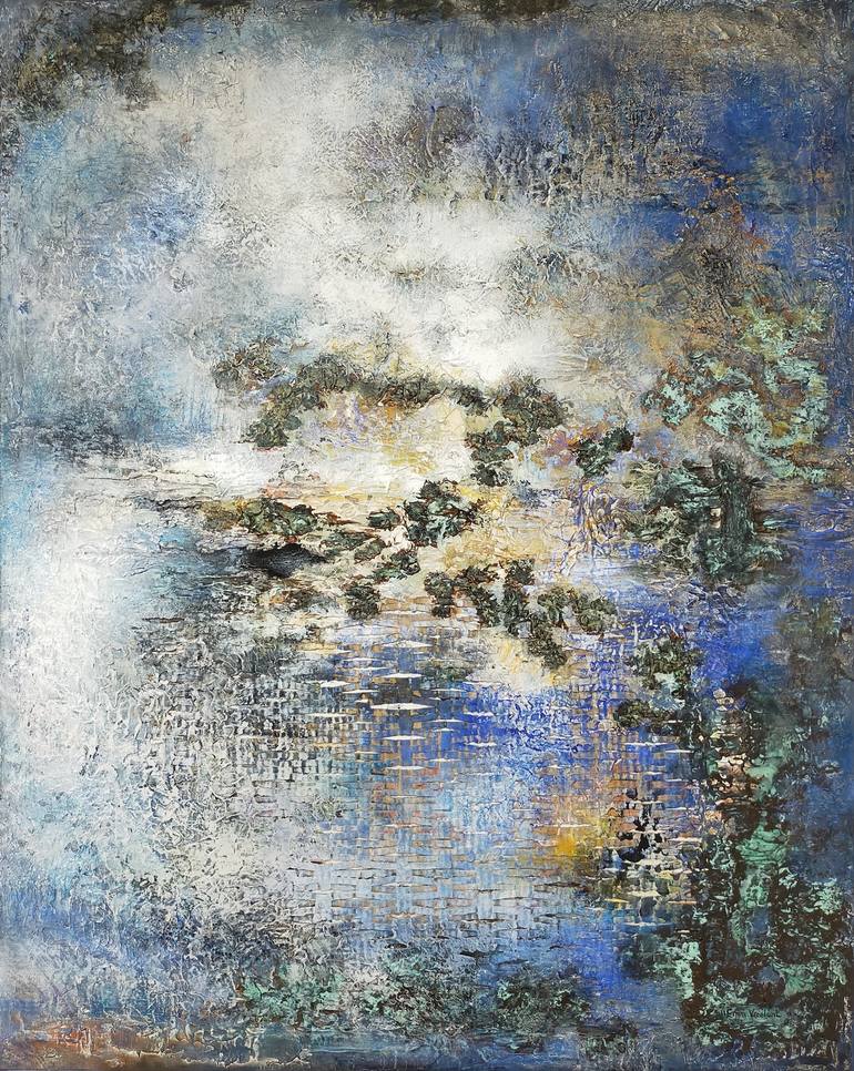 “My inner energy, it must come out, and live” Everything is met, some of them are fundamental: • Caravaggio for its dark light • Vermeer, for its delicacy and understanding of light, • Kandinsky, for his spontaneity, • Soulages, for the strength of his gesture, • Richter for colour overlays • And above all, Zao Wou-Ki, my true pictorial encounter, for the subtlety of his living spaces that he offers us, empty inhabited by the silence and wind that transcend everyday life. I paint on canvas or on wood. I first work the structure with mortar, marble powder, handmade paper made in South East Asia. I like that you can touch my paintings, feel the grain. I let come and I dialogue using acrylic, pigments, the oxidation process of copper, bronze or iron, in search of movement, light and breathing of the color. If I were to qualify my current painting, I would speak of suggestive abstraction.