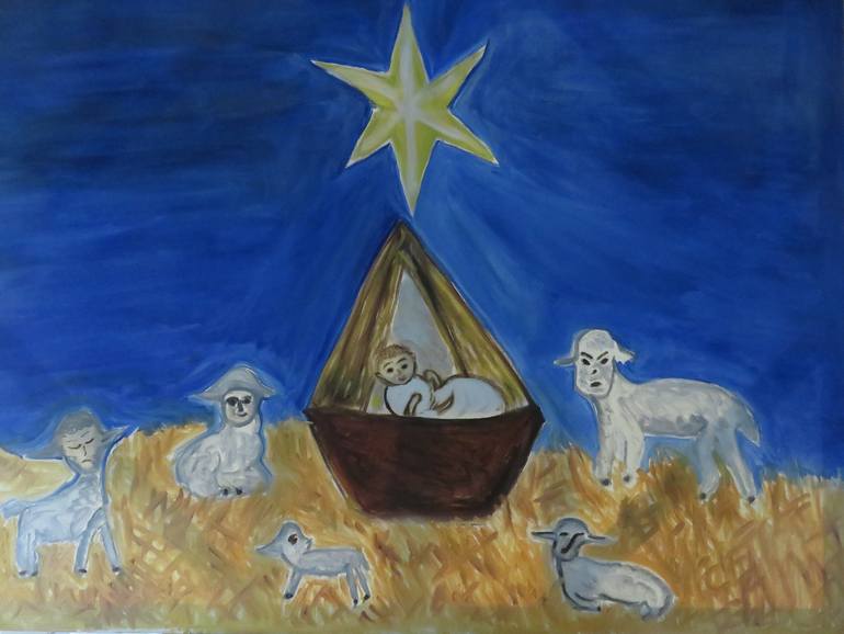 I had the honor to touch up my church's Nativity figures (the plaster was chipping after so many years outside in the cold). I fell in love with one lamb I spent a day painting. I then decided to paint my own Nativity Scene with the beloved lambs who watched over the Baby Jesus.