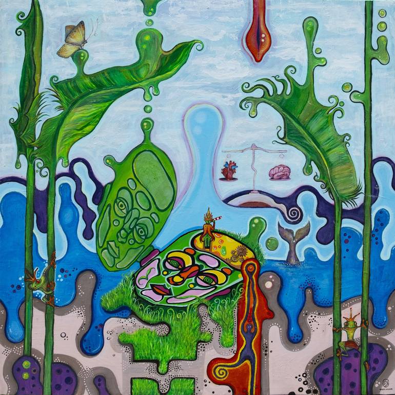 The "Tirpstantis galvoklis" painting depicts a king with an open mind, suggesting that we shape our own reality through our thoughts and actions. The balanced scales with a heart and a brain, Strelitzia Reginae leaves, two frogs, a tail of a whale with a melting spiral, a butterfly, and a melting re...