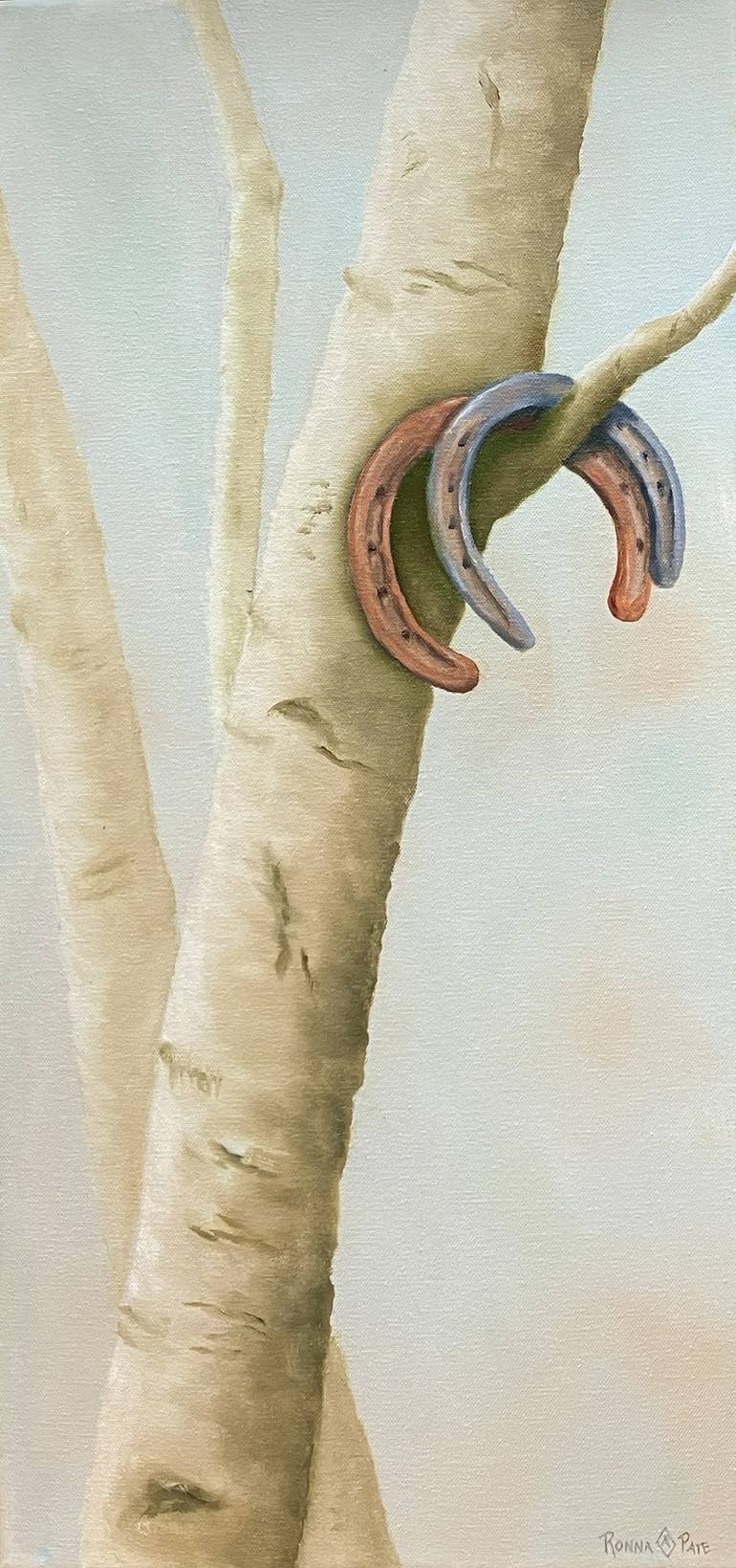 Western folklore has it that if you find a horseshoe in the woods, it is customary to hang it on a tree branch. My birch trees are a perfect fit! My artwork is inspired by my Grandfather, a cowboy in his younger days, whose stories I heard as a child made me fall in love with all things Western. Oil...