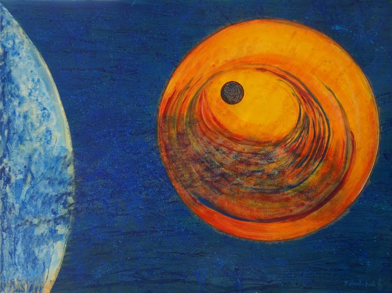 Inspired by the transit Venus moving over the sun, a few years ago. Transit of Venus 1 shows Venus as a large planet beginning the transit. Transit if Venus 2 shows it already in front of the sun as a small orb. The two paintings would look very elegant hung together telling the full story of this ...