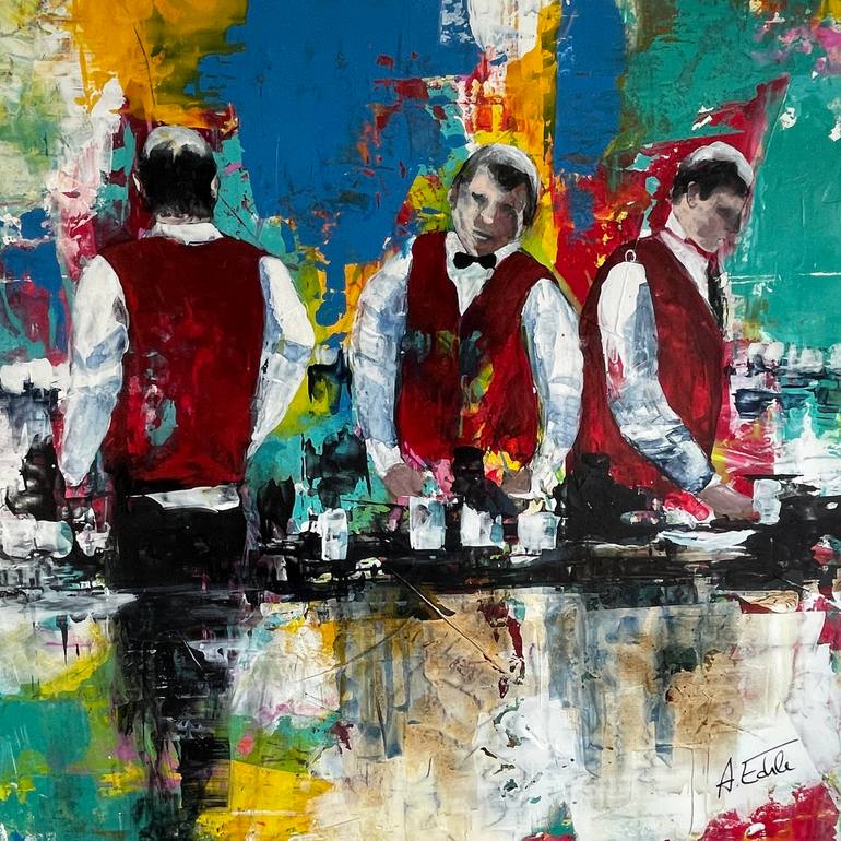 This artwork captures three bartenders in abstract blur yet distinctly recognizable. Each wears a white shirt with a bow tie and a red vest, unmistakably identifying their profession. They are depicted in a lively bar scene, abstractly rendered with vibrant colors. The backdrop resembles a bar envi...