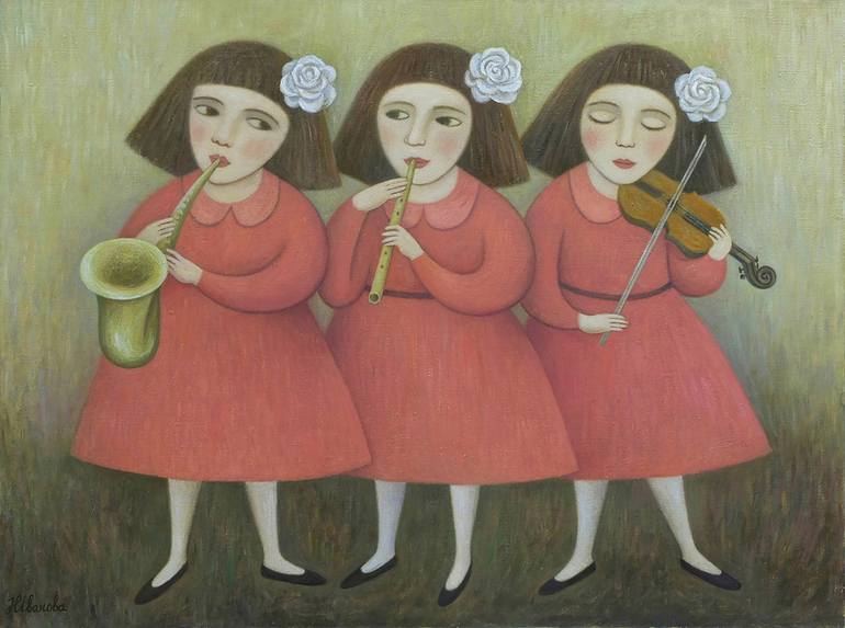 In my work, I have several themes. One of them is the theme "Music".This painting "Trio" is made in a multi-layer painting technique with oil paint. It is full of tenderness and harmony, which these lovely, young musicians are diligently playing.