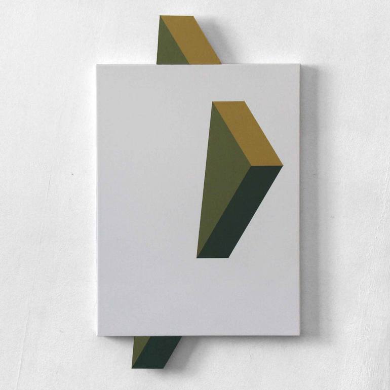 A three-dimensional triangle taking root outside the format, seems to pierce its canvas support, emerging like an iceberg vertically. The real two-dimensional figure, when it deludes itself into three, enjoys deceiving the viewer while being aware that he himself enjoys being fooled.