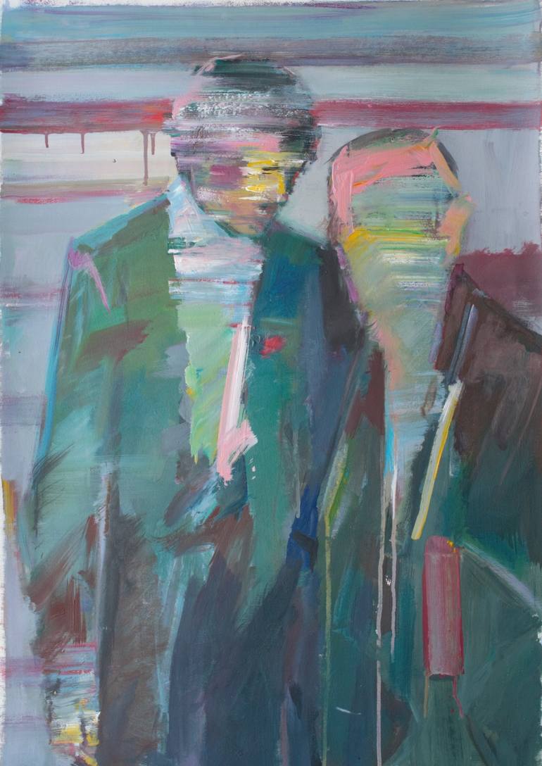 The portraits of young people are a way to raise the topic of publicity and privacy in the modern digital age, where individual features are depersonalized and real emotions are absent and blurred. Therefore, this painting creates a double feeling, a struggle between two incompatible elements: the m...