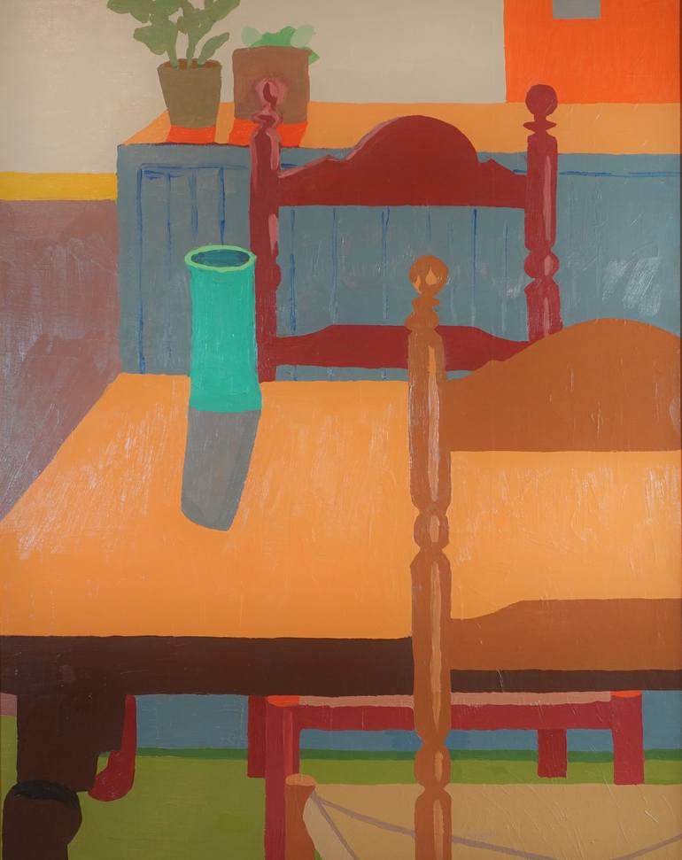 I saw the light coming through the window onto the table. I changed the colors many times to make it look spatial and in the process, reduced the design to it's most simple shapes. The green of the glass is luminous against the orange and gray and red. It has thick textured paint.