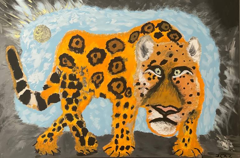 I painted this with my eight year old son. We both love wild cats and started the painting wanting to create an interesting and unique jaguar. We were going for impressionistic abstract. We wanted the intensity in this cat's eyes to represent the deep longing in every creature, both animal and human...