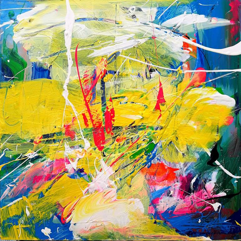 This is one-of-a-kind original artwork by Vera Komnig, made with high quality colors, passion and joy. Warm summer colors, shades of yellow, pink and orange evoke the radiant sun and tropical landscapes. Green nuances depict the lush vegetation and exotic nature. Blue and turquoise accents provide...