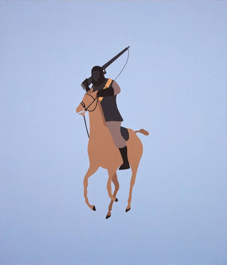 This painting is from Takeover series which features the famous pony logo of Ralph Laurent. Now that the polo player was superseded by the ape soldier, there is no mallet but you see a rifle instead.