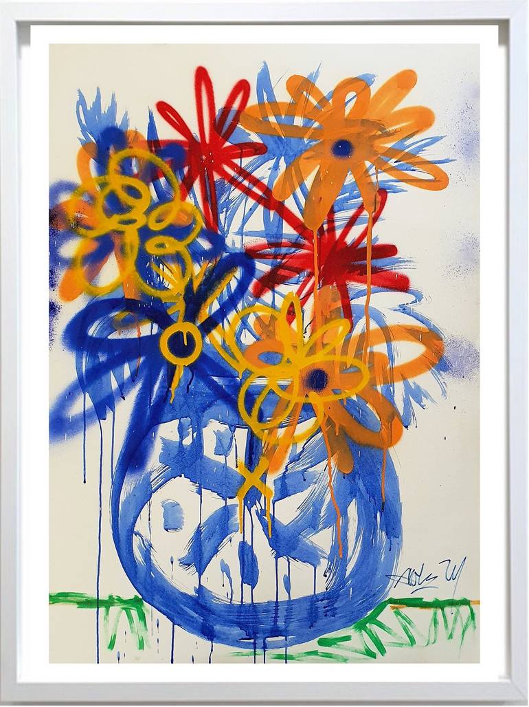 Mister Artsy . Talking Flowers Work on paper : 70 x 100 cm (NOT framed). Acrylic/spraypaint on cotton artpaper 400 g/m2. (floating framing : size advice / 102 x 130 cm white or black frame) Mister Artsy Graffiti and Streetart Roots in street art and graphic design. Always inspired by minimal art...