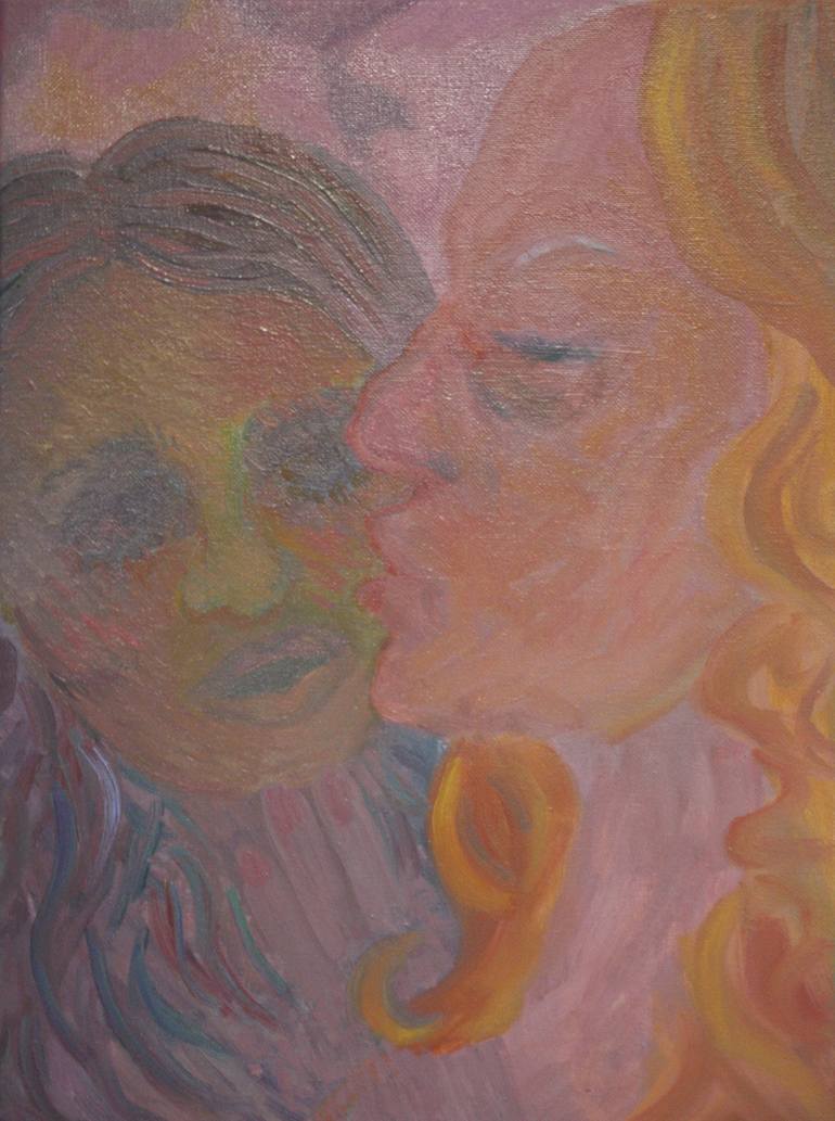 A stretched painting, with layers of colours and marks, that explores relationships between women