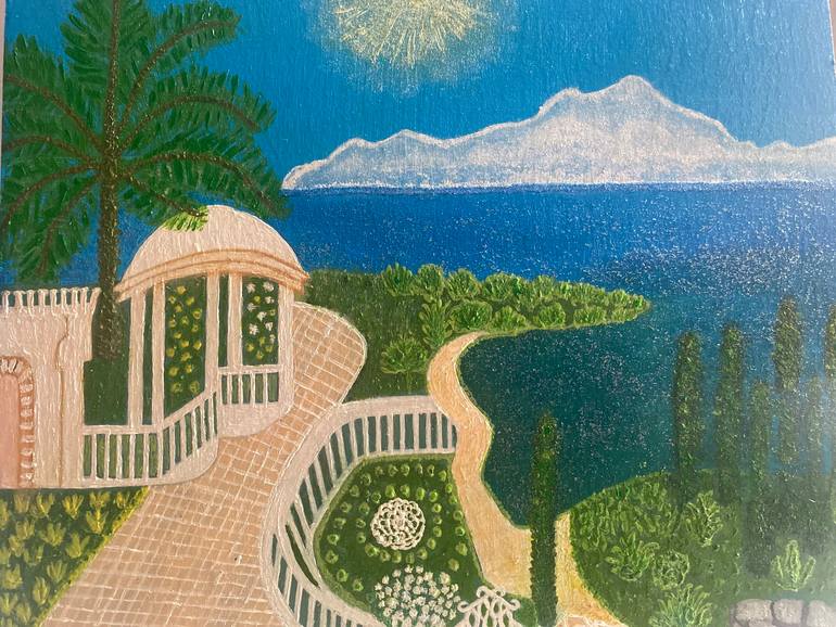 The huge sun fills with light and brilliance the azure sea surrounding tropical vegetation. Low clouds in the heat above the sea look like white mountains, tall palm trees and cypresses, an island with huge stones and a garden with flower beds and a footpath along the sea for walking next to the vil...