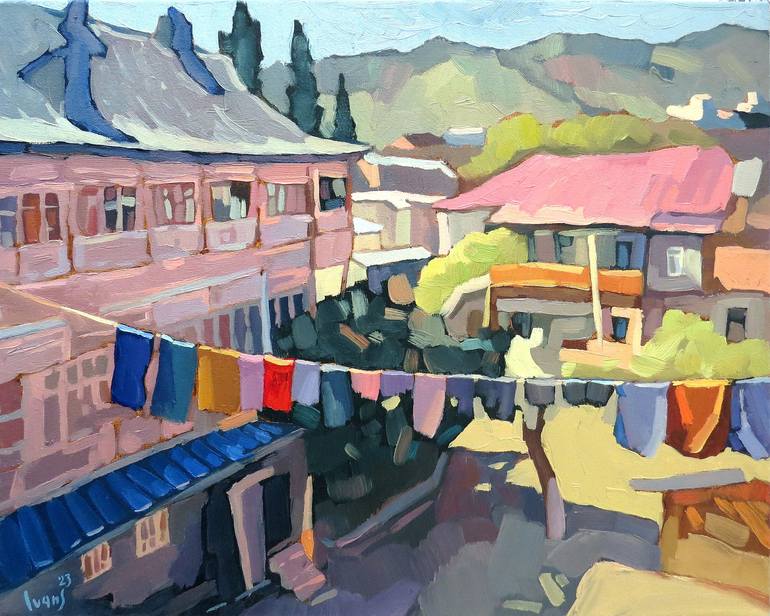 An beautiful summer painting from Georgian trip, view of old Tbilisi yard idyll. Canvas stretched on wooden frame and the sides are completely painted, the painting is ready to hang. (No frame or stretching needed.)