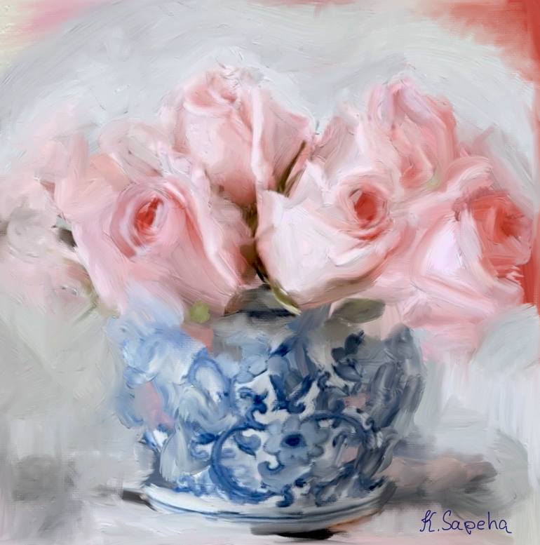 Flowers in chinoiserie jar. Oil on cotton canvas. Stretched on 4 cm wooden stretchers. UV varnished with gloss Pebeo varnish.
