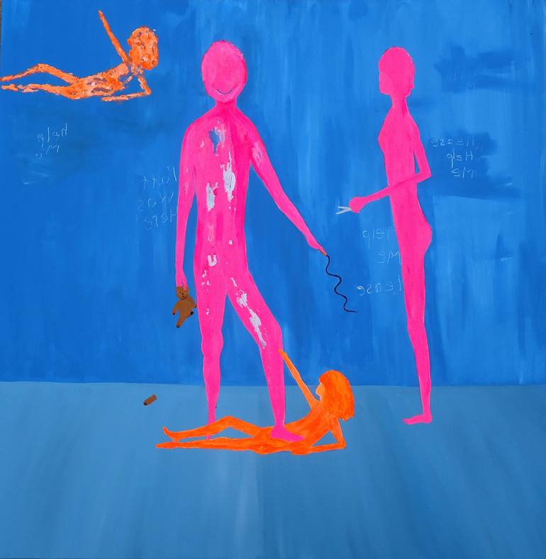 This painting shows a child dissocating from the pain of being abused by two adults. The childs teddy has had it's leg cut off by the adults, one of the adults has a grin on his face giving the impression that he is enjoying causing pain to the child.