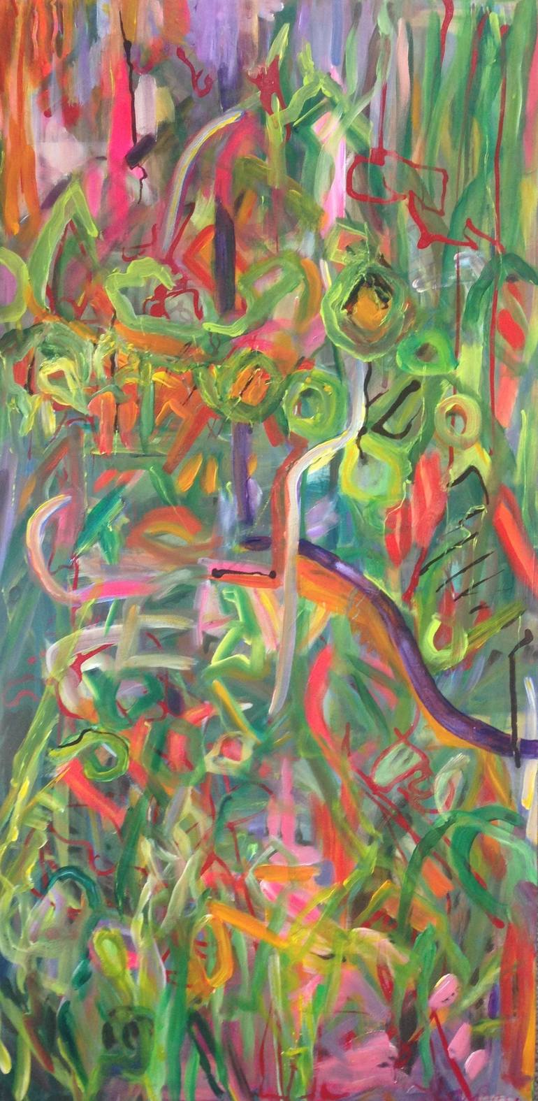 A visit to a botanical garden on a hot day sparked this painting. I sketched as I walked through the snaking walkways, ducking under vines and rampant plant growth. Sense of lushness and alien life. Sense of secret depths and levels of life.