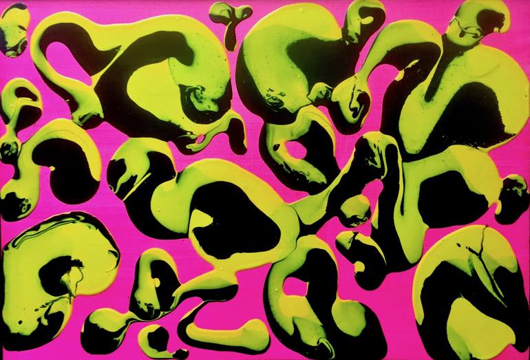 I studied at Camberwell School of Art London, at that time largely known for producing figurative painterly artists. However, I was influenced by abstract painters, and moved away from the figure. My art developed into large-scale painterly figurative based abstract painting, using oil on canvas, always more tonal than colourist. Having always lived in London, the energy of a big city has soaked into my being and I began to move away from observational painting to using images from my experience and imagination rather than what was immediately in my field of vision. I spent several years living and working in Barcelona, here my work began to take another direction, it was not a conscious decision, it just happened. In recent years I moved away from using oils to acrylics and began experimenting with a variety of paints, mostly interference and fluorescent, along with pens and sprays and creating my own stencils, the results pushed me further into another direction. I had never considered myself a colourist, but as time has passed I have become increasingly more interested in colour and how pigments react with each other. Sometimes choosing to use pure colour from the tube, at other times mixing. The new materials allow me to combine complicated layers with intricate pen details or stencil work. Ultimately, they are not decorative, despite having elements of repeat pattern and motifs, the imagery is intended to offer an alternative reality, not identifiable but always present, lurking under the surface. The city stimulates me in every way, its many layers and complexities which come into play in my imagery. The visual overload. I am interested in finding ways of translating this energy and chaos into a painting, which whilst being one flat surface, can also provide depth and dimension and optical excitement. My art is executed by hand, by brush, by pouring or dragging paint, mark making, yet can appear digitally enhanced or manipulated. Technology is an influence because in contemporary life we are increasingly surrounded by it and reliant up on it. However, by choosing to use traditional mediums, such as paint on canvas, I am also reacting against technology to produce something unique, hand made and coming from within me. I work in series, each one feeding off each other. I have a wide range of interests that often require a different technique, forcing me to adapt and experiment.