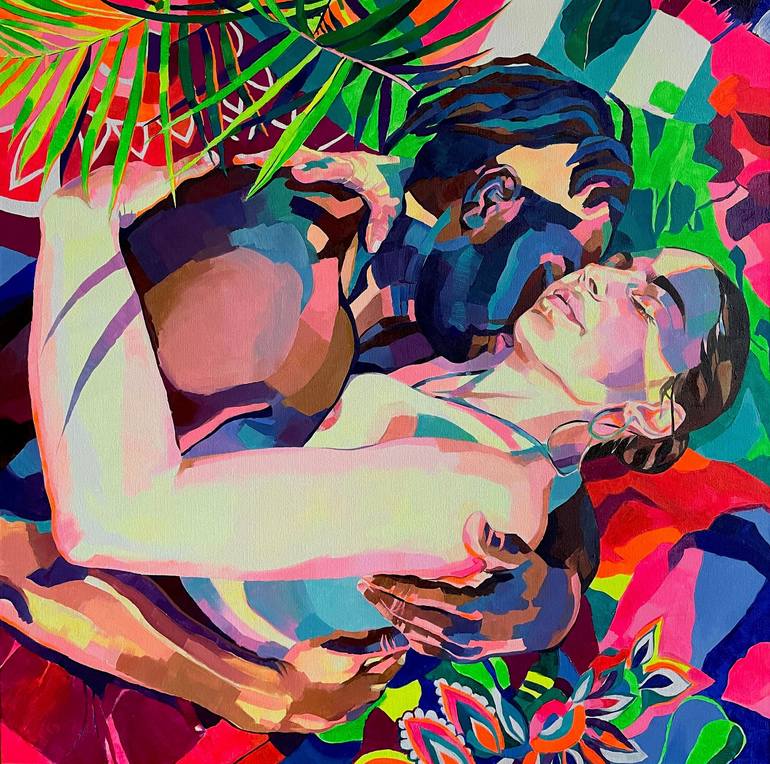 The painting captures a tender moment between two young lovers, a Greek woman and a Black British man, as they embrace in a serene, intimate setting. With her eyes half-closed and her neck gracefully extended, the woman awaits a kiss from her partner, embodying both vulnerability and trust. They res...