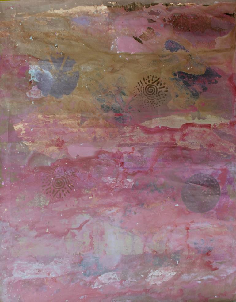 Acrylic, collage and lithography on fabric. 2023. On this acrylic painting I engraved images that replicate two pre-Hispanic goldsmith pieces that were found in what is now Colombia. In the upper left part I represent a flower-shaped piece hammered in tumbaga (gold and copper alloy). In the lower ...