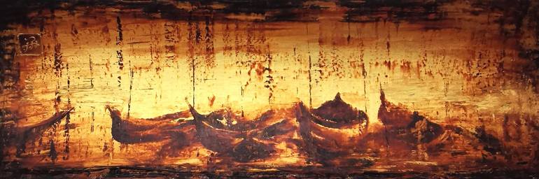 Discover the enchanting allure of this metallic oil painting created on a curved wooden surface (87 × 28 × 5 cm). This artwork features boats gracefully drifting through a golden-hued landscape, evoking a deep sense of nostalgia and tranquility. The rich interplay of warm amber, deep brown, and shim...