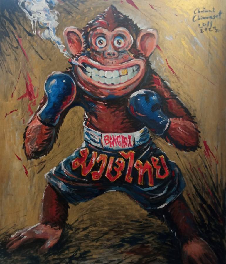 Thai culture funny . and imagination. I am cartoonist is my style. I paint quickly convey emotion. Expressionist pop art. (2023) painting acrylic on canvas 122×101cm This character monkey Thai boxing . Story my cartoon comic coming soon.