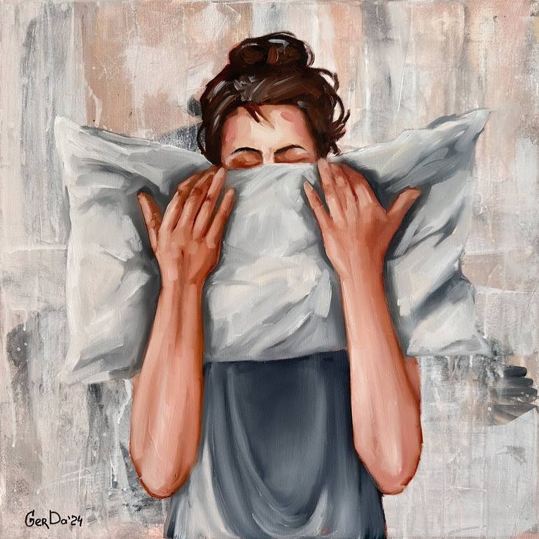 Title: That's all I need right now. In this painting, I explore the intimate moment of serenity and comfort, using acrylics and oils to capture the tactile experience of embracing a soft pillow. The subdued colors and gentle brushstrokes evoke a sense of tranquility, while the realistic approach hi...