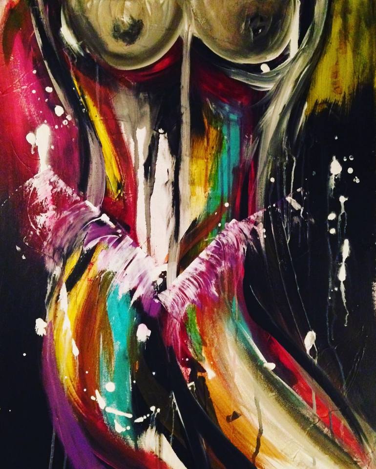 This painting was created at a live burlesque show in 2015. I was asked to create something that would excite the audience as I painted. The inspiration I chose was the actual burlesque dancer who opened the show. Her wild and decadent moves inspired me to use these acidic/bright colours - with the ...
