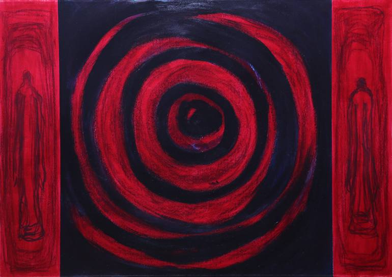 This artwork is a visual exploration of the human psyche, delving into the depths of the subconscious. The vibrant red and black colors create a sense of intensity and drama, while the swirling, circular forms evoke a sense of movement and energy. The two figures, standing on the periphery, seem to ...