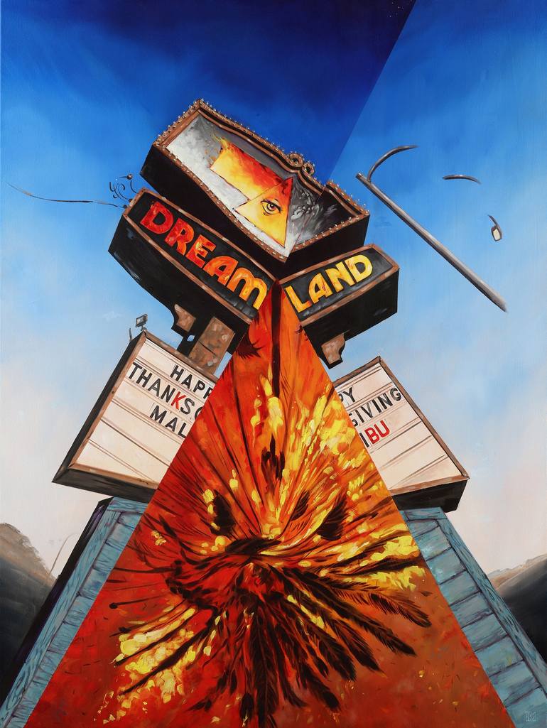 "The American Dream (Alien in Los Angeles Burning)" is a captivating oil and color painting on canvas and wood that offers a unique perspective – literally. The wired construction allows the owner to hang and view this medium-sized artwork either right side up or upside down, inviting contemplation ...