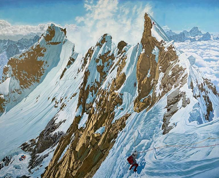Alexander Heaton's work reaches deep into the imagination, searching for mans most primeval interaction with nature. His paintings attempt to capture that first interaction, and the sense of wonder and spirituality as humanity confronts omnipresence. Alex works from experience, researching and conducting studies in remote natural settings. Through long and meaningful communion with nature his many drawings and paintings assert the inherent worth of deep spiritual reflection and recognise union with land and the elements. He also uses cut up techniques to sample found photography from retro mountaineering literature to journey to some of the more extream places on the canvas that he has not personally been able to visit. Alex often draws upon mystical experiences and noetic connections to illustrate in paint the words of the divine presence felt in the places he chooses to depict. He draws upon such wells of references as shamanism, mythology, gnosticism, extreme sports, and ecstatic mountain lore. Landscape Artist As a mountaineer Alex, studies and researches themes directly. He often thinks nothing of walking and climbing to remote places in the Himalaya or Alps just to cast an eye on his artistic muse – "I am the lonely figure lured by mountains, dark forests, alpine skies and forbidding ravines." The paintings look out from dreamy summits and contemplate the beyond. Through his canvases he continues on the Romantic journey, but updates this visual language with the possibility of going to higher, more challenging and steeper places. "My work teeters on the edge of a filmic realism and also at times uses sampled vignettes of other climbers photographs." There are hints of something more transcendant in the dark forests and crumbling glaciers that populate his works to date. It’s this struggle that fascinates him to keep painting. Recent works transports the viewer to hallucinatory and altered worlds. These are not real places, but are constructs of sublime vistas I have experienced or sampled. The work touches on a common longing in us all to escape the modern urban landscape and throw oneself whole heartedly into serene expanses, and witness at first hand awe-inspiring natural phenomena. This isn’t always possible on a day-to-day basis, but painting as substitute for exploration can be. However, the work at times offers us dangerous realities of complete desolation or abandonment at the ends of the world.