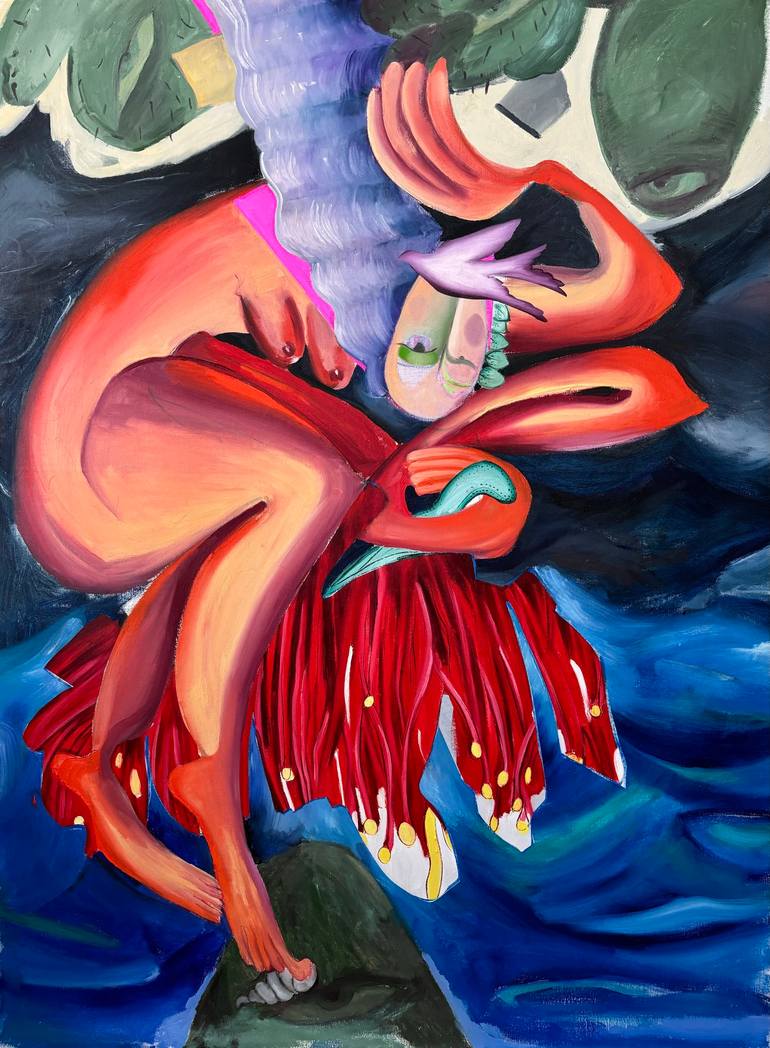 Ioana Tocoaie ( b.1998), is an emergent artist from Romania. She completed her bachelor's and master's studies at the University of Art and Design in Cluj-Napoca, currently working in her hometown, Sibiu. His artistic practice centers around the fantastic, superimposing recognizable elements from a feminist area with metamorphosed fragments, contradictions of reality. Artworks are assembled like a puzzle, a collage of fragments, touches gestures or recognizable elements, a complex game, a scenography as such. A show that every viewer consumes before deciphering it. She built a utopian habitat by implementing imaginary, fantastic elements. The main character, a personal look of the female character is found in most of her artworks. It creates a relationship between feminist discourse and natural elements transposed through the image collage, all coexisting on the same surface. In works such as "My inner wolf" or "Leviathan" it is possible to decipher the route she takes by detaching herself from precise references.