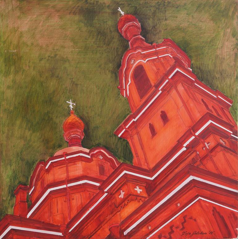 I was inspired by the color of Andy Vorhal's painting - Electric Chair, which I saw in Stockholm. That's why I used these two shades of green and red in this work. And the church is only our attitude - to ourselves, to architecture, to art.