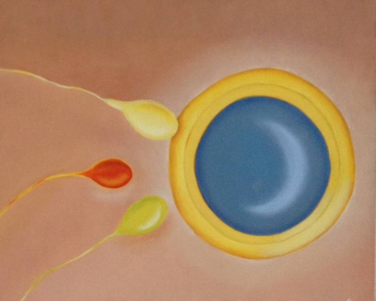 Three sperm cells, each with a unique genetic combination, compete to reach the zona pellucida of the ovum. All but one cell will accomplish this feat, marking the beginning of a new life.