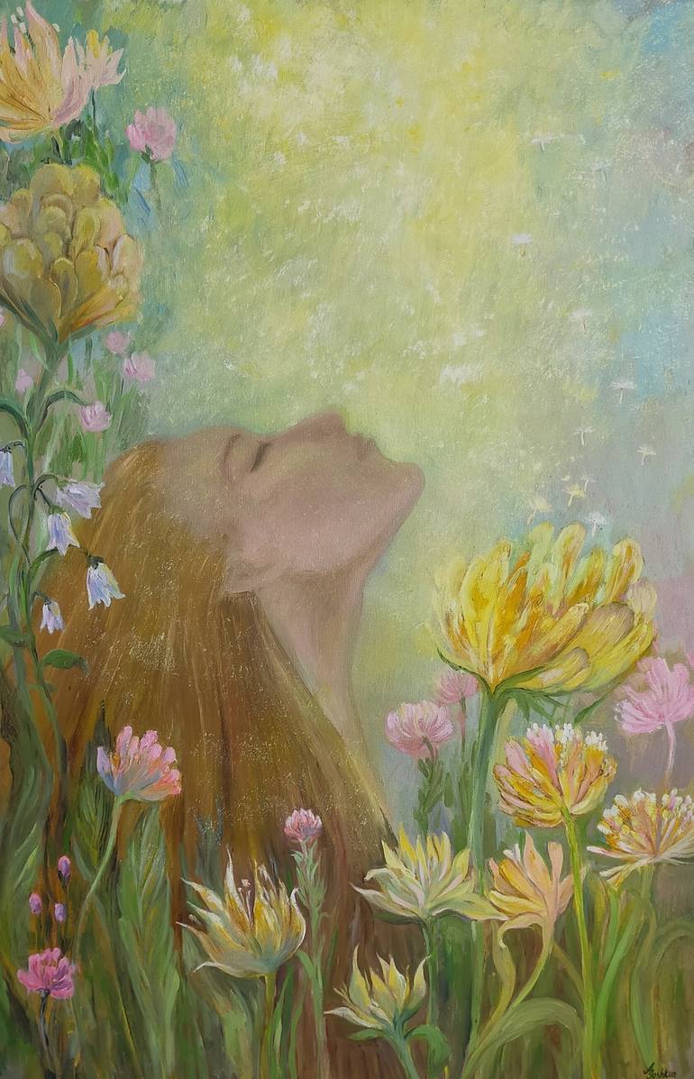I really wanted to write something very warm and tender. I was inspired by the flowers surrounded by light and the clear blue sky when I was in the Almaty Mountains. The painting depicts a girl with long, beautiful blonde hair. Most likely, I drew my feelings and myself. Summer flowers and a gentle ...