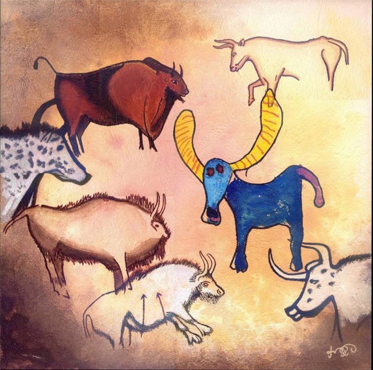 Inspired by the cave paintings of Lascaux, graffiti, and a drawing of a blue bull my son did when he was four.
