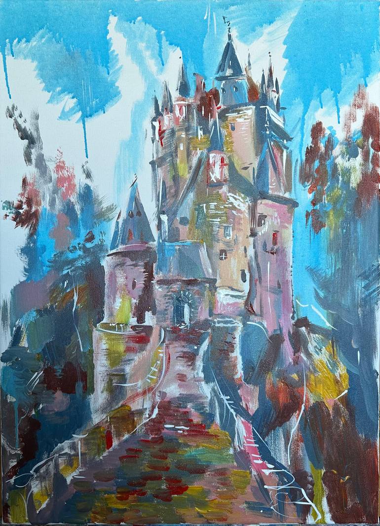 The blue castle in the rain. Elz Castle in Germany. Tempera on canvas.