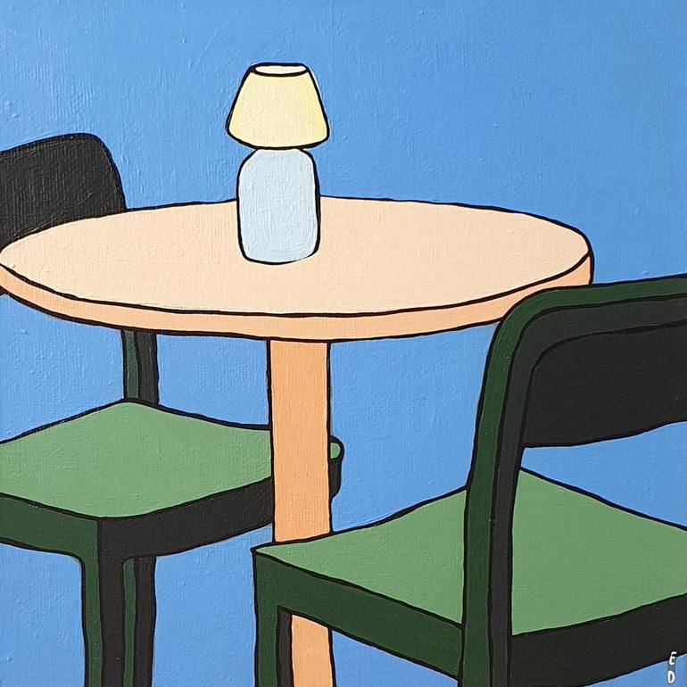'The Blue Room' Acrylic and Ink on canvas board (unframed) This piece depicts a composition of green chairs in a blue room with a small lit table lamp
