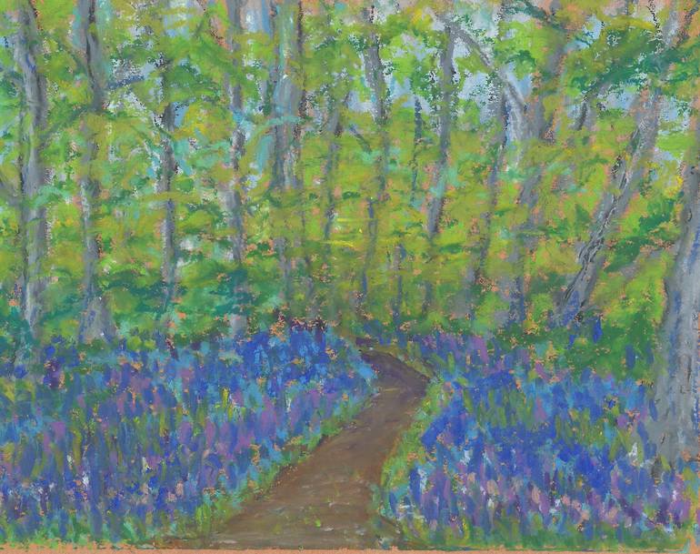 A small oil pastel of a path through woods with Bluebells lining the path.