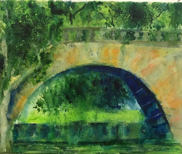 The work was inspired by visits to a Botanical garden . I was very inspired by the rich green textured foliage and the old sandstone bridge. I sat drinking coffee making in situ watercolour and soluble oil pastel studies then made the painting back at my studio. I wanted to convey the peacefulness o...