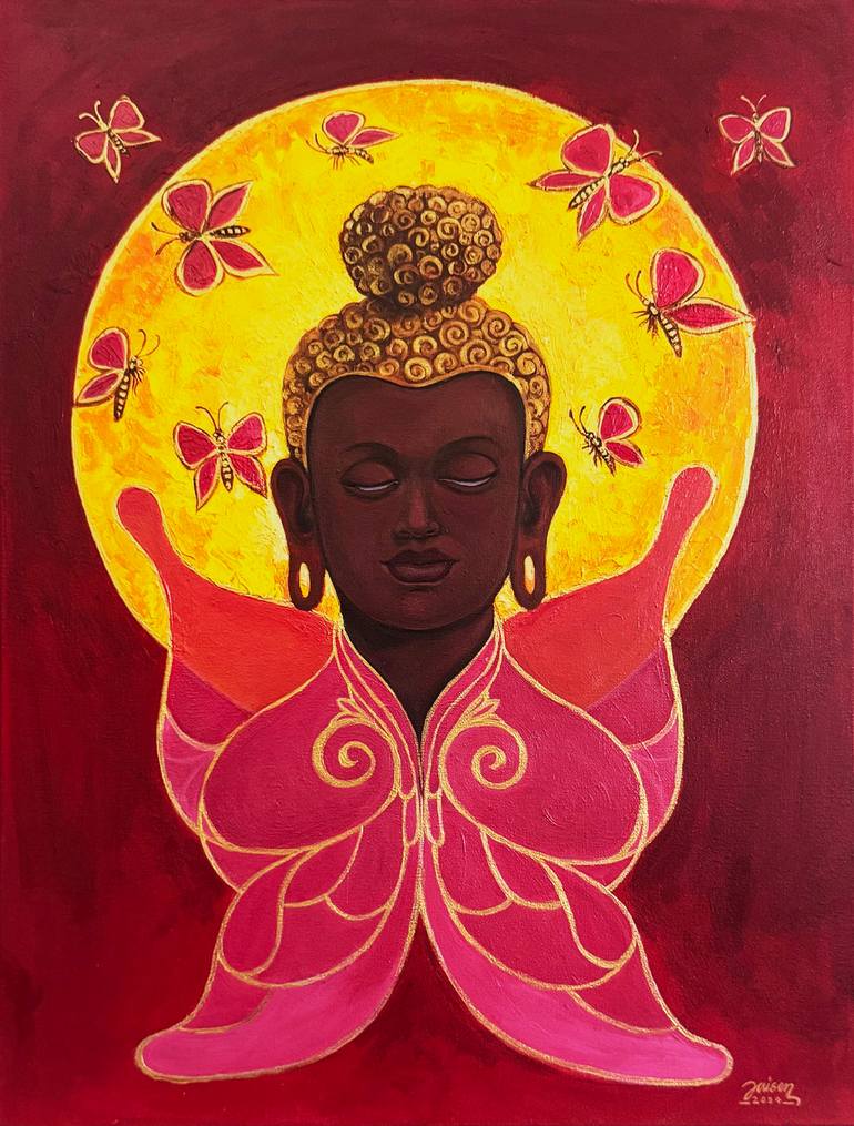 This acrylic painting beautifully symbolizes transformation, enlightenment, and the impermanent nature of existence. The central figure of Buddha, serene and meditative, is framed by the graceful wings of a butterfly, merging the themes of spiritual growth and natural metamorphosis. The butterfly r...
