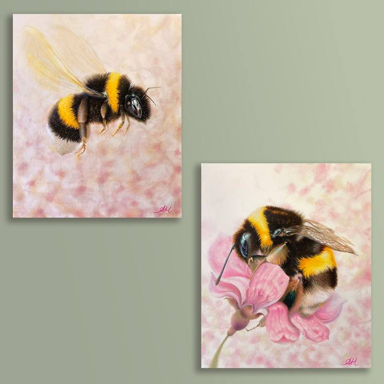 Original acrylic paintings. Back to painting my love for bees again, especially the bumble bee. Two petite artworks this time showing a bee doing what they do best, feeding and pollinating. Then another flying home full of pollen after a busy day on the job. You can choose your own way to display ...
