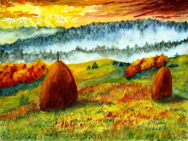 Title: "The Carpathians autumn" Size: 9" by 12" (23 cm by 31 cm). Materials: watercolor paper 300g/m2, watercolor paints, artist brushes Artist: Tetiana Teresh Country: Czech Republic Creation date: 2024 The sunrise on an autumn morning in the Carpathians is filled with the charm of different color...