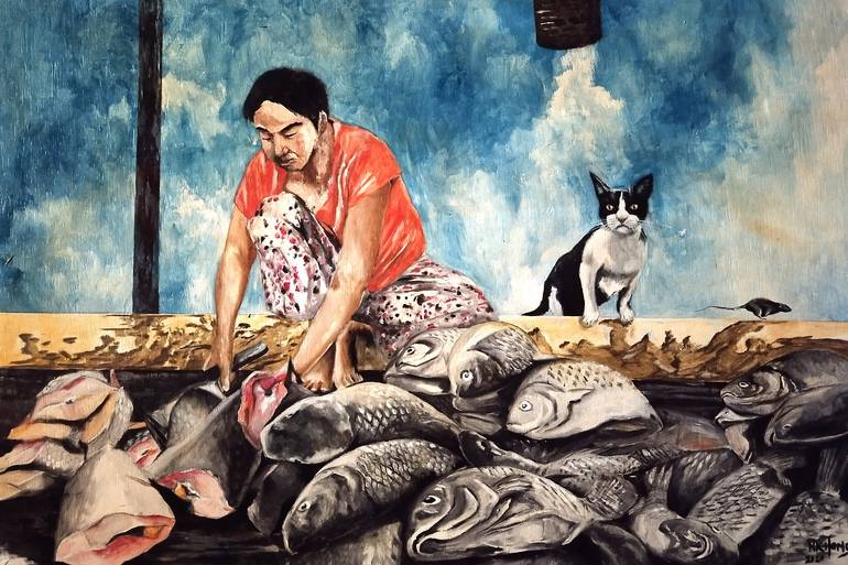The fish market at Bagan is an interesting place to walk around. The grey tones of the fishes in the foreground are reflected with contrasting shades of blue in the background so as not to dull the painting. A nearby cat eyes the fish, balancing the scene in this painting of a woman cutting the fish...