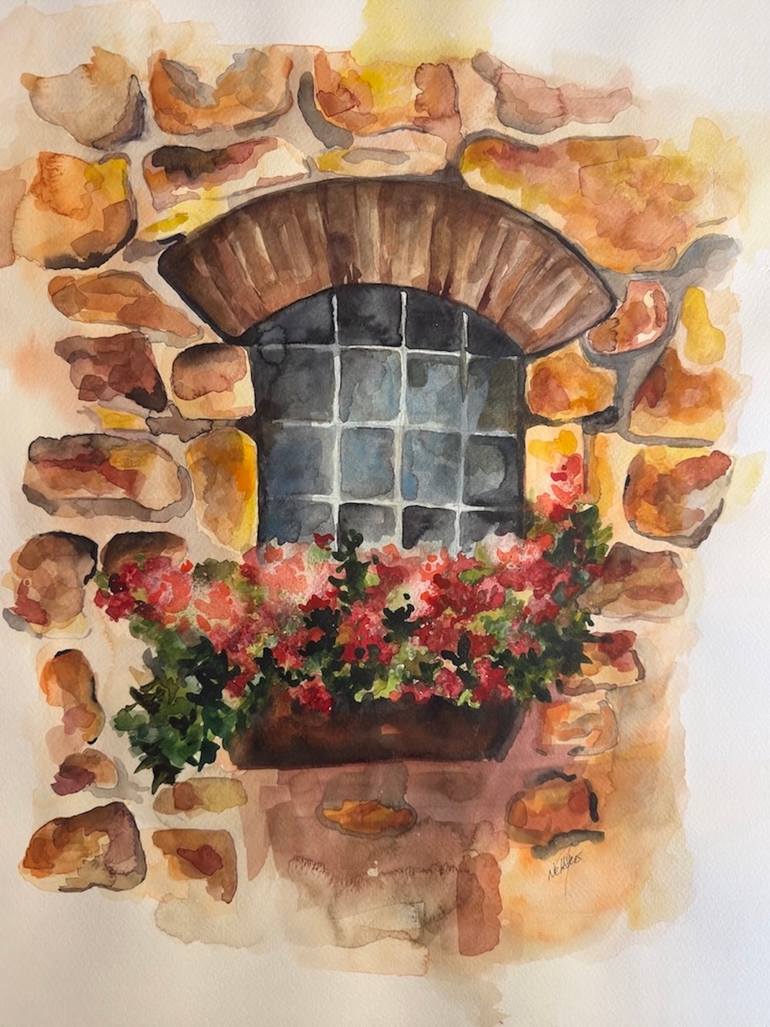 In this watercolor piece, I captured the rustic charm of a traditional Tuscan stone window adorned with vibrant bougainvillea. The interplay between the rough-hewn stonework and delicate flowers creates a compelling contrast. Warm earth tones to convey the sun-baked stones, while the deep greens and...
