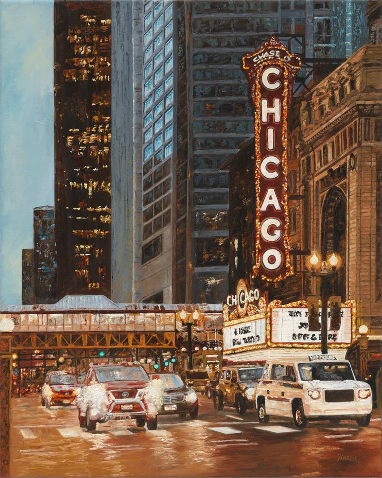 As twilight descends on Chicago, the city’s vibrant energy truly comes alive. The iconic Chicago Theatre sign lights up the bustling street, casting a warm, inviting glow over the urban landscape. Cars move steadily along, each one reflecting the city's unique pulse and rhythm. Overhead, the elevate...